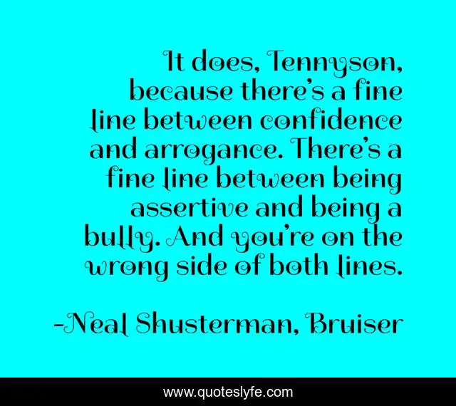 This page presents the quote "It does, Tennyson, because there’s a fine line between confidence and arrogance. There’s a fine line between being assertive and being a bully. And you’re on the wrong side of both lines.". Author of this quote is Neal Shusterman, Bruiser. .
