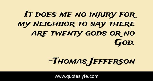 This page presents the quote "It does me no injury for my neighbor to say there are twenty gods or no God.". Author of this quote is Thomas Jefferson. This quote is about me, neighbor,.