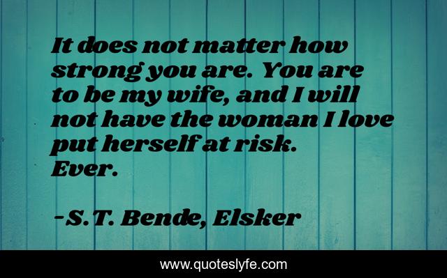 This page presents the quote "It does not matter how strong you are. You are to be my wife, and I will not have the woman I love put herself at risk. Ever.". Author of this quote is S.T. Bende, Elsker. This quote is about alpha-male, elsker, love, affection, wife,.