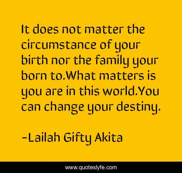 This page presents the quote "It does not matter the circumstance of your birth nor the family your born to.What matters is you are in this world.You can change your destiny.". Author of this quote is Lailah Gifty Akita. This quote is about circumstances, you-can-do-it, destiny,.