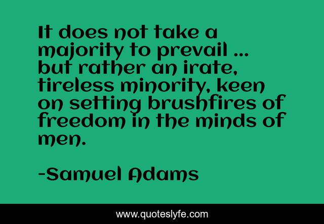 This page presents the quote "It does not take a majority to prevail ... but rather an irate, tireless minority, keen on setting brushfires of freedom in the minds of men.". Author of this quote is Samuel Adams. This quote is about activism, minority,.