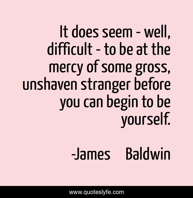 This page presents the quote "It does seem - well, difficult - to be at the mercy of some gross, unshaven stranger before you can begin to be yourself.". Author of this quote is James Baldwin. This quote is about relationships, self, men, identity, women,.