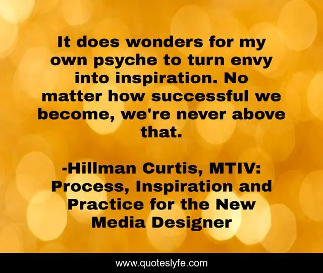 This page presents the quote "It does wonders for my own psyche to turn envy into inspiration. No matter how successful we become, we're never above that.". Author of this quote is Hillman Curtis, MTIV: Process, Inspiration and Practice for the New Media Designer. This quote is about envy, art, success, self, psyche, design, inspiration,.
