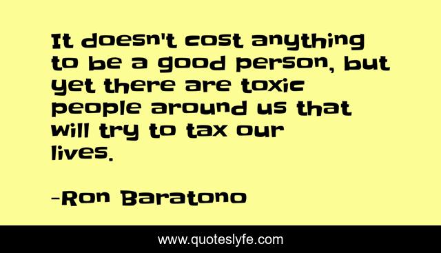 This page presents the quote "It doesn't cost anything to be a good person, but yet there are toxic people around us that will try to tax our lives.". Author of this quote is Ron Baratono. This quote is about behaviour, attitude, lives, life, people,.