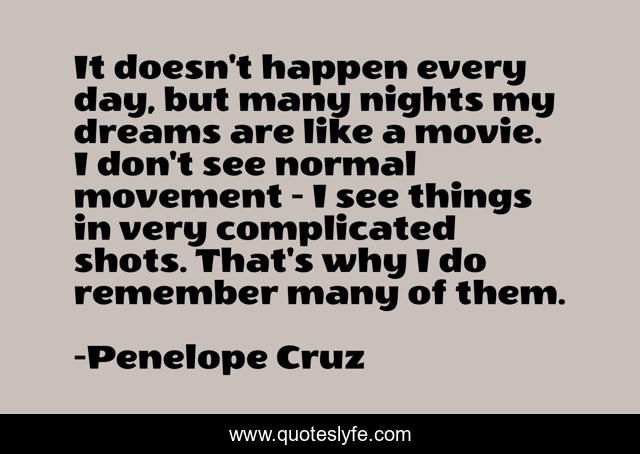 This page presents the quote "It doesn't happen every day, but many nights my dreams are like a movie. I don't see normal movement - I see things in very complicated shots. That's why I do remember many of them.". Author of this quote is Penelope Cruz. This quote is about remember, why, day,.