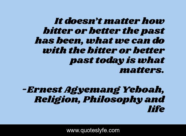 This page presents the quote "It doesn’t matter how bitter or better the past has been, what we can do with the bitter or better past today is what matters.". Author of this quote is Ernest Agyemang Yeboah, Religion, Philosophy and life. This quote is about bitter-past, learning-from-adversity, learning-from-the-past, learning-from-our-struggles, success,.