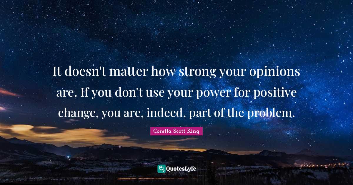 This page presents the quote "It doesn't matter how strong your opinions are. If you don't use your power for positive change, you are, indeed, part of the problem.". Author of this quote is Coretta Scott King. This quote is about use, problem, strong, power, positive change, matter, mistake,.