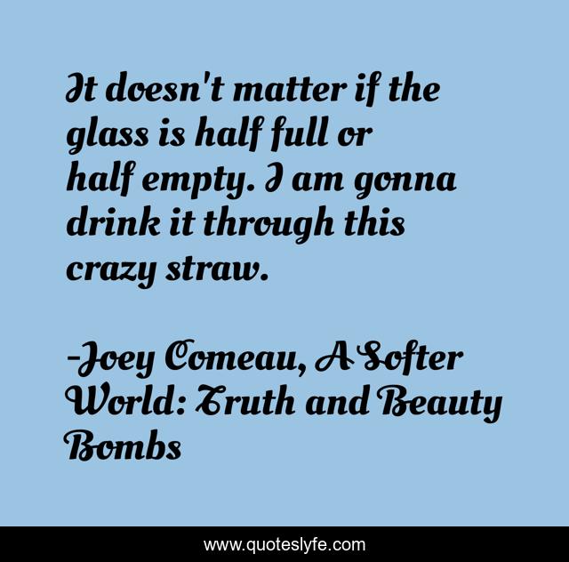 This page presents the quote "It doesn't matter if the glass is half full or half empty. I am gonna drink it through this crazy straw.". Author of this quote is Joey Comeau, A Softer World: Truth and Beauty Bombs. This quote is about pessimism, perspective, optimism,.
