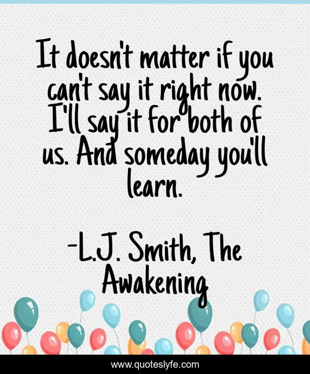 This page presents the quote "It doesn't matter if you can't say it right now. I'll say it for both of us. And someday you'll learn.". Author of this quote is L.J. Smith, The Awakening. This quote is about elena, stefan, vampire,.