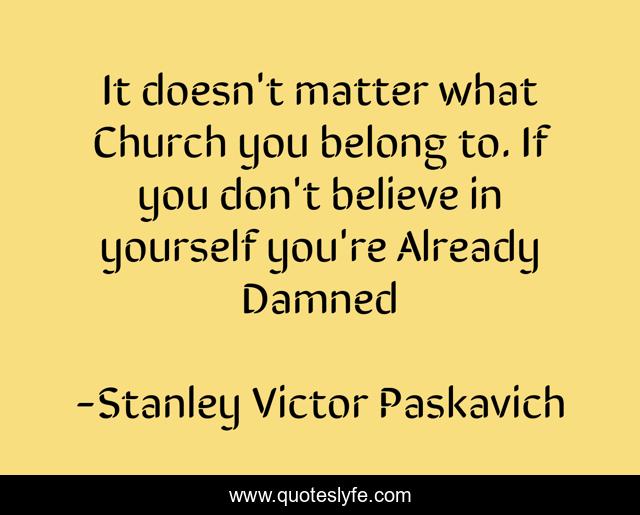 This page presents the quote "It doesn't matter what Church you belong to. If you don't believe in yourself you're Already Damned". Author of this quote is Stanley Victor Paskavich. This quote is about religion, life, belief, stantasyland, church,.