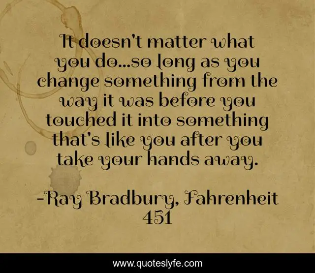 This page presents the quote "It doesn't matter what you do...so long as you change something from the way it was before you touched it into something that's like you after you take your hands away.". Author of this quote is Ray Bradbury, Fahrenheit 451. This quote is about enthusiasm, inspirational,.