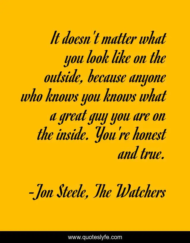 This page presents the quote "It doesn't matter what you look like on the outside, because anyone who knows you knows what a great guy you are on the inside. You're honest and true.". Author of this quote is Jon Steele, The Watchers. This quote is about real-self, honesty, truth,.