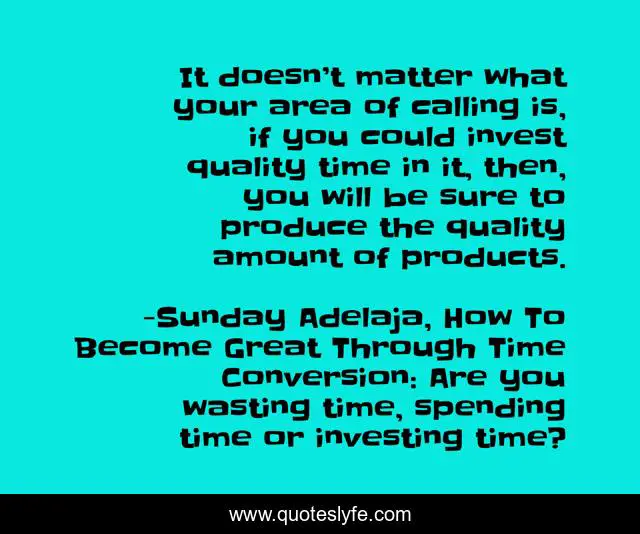 This page presents the quote "It doesn’t matter what your area of calling is, if you could invest quality time in it, then, you will be sure to produce the quality amount of products.". Author of this quote is Sunday Adelaja, How To Become Great Through Time Conversion: Are you wasting time, spending time or investing time?. This quote is about life, investment, conversion, productivity, wealth, area-of-calling, time-investment, greatness, waste,.