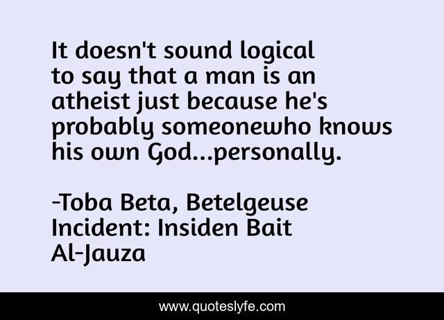 This page presents the quote "It doesn't sound logical to say that a man is an atheist just because he's probably someonewho knows his own God...personally.". Author of this quote is Toba Beta, Betelgeuse Incident: Insiden Bait Al-Jauza. This quote is about life, god, personally, logical, atheist, freedom,.