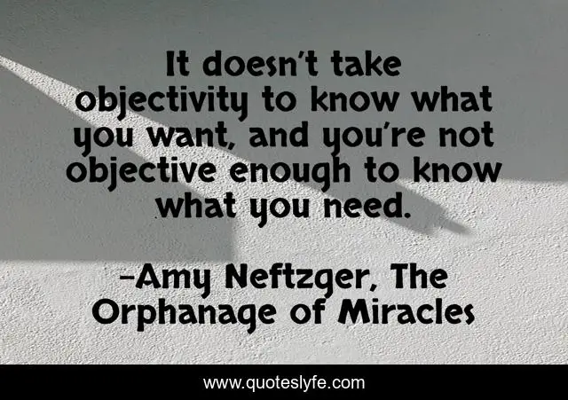 This page presents the quote "It doesn’t take objectivity to know what you want, and you’re not objective enough to know what you need.". Author of this quote is Amy Neftzger, The Orphanage of Miracles. This quote is about wants, needs, desires, perspective, objectivity-subjectivity, objectivity,.