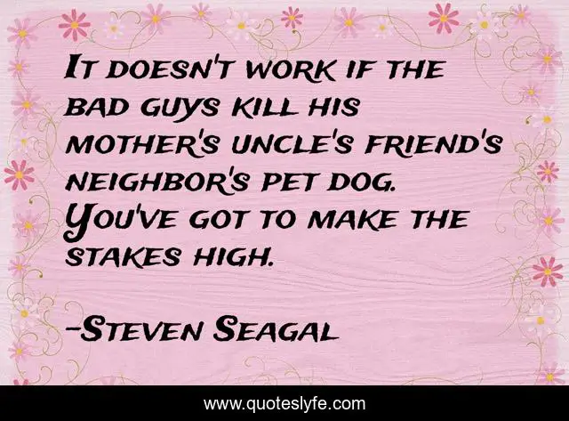 This page presents the quote "It doesn't work if the bad guys kill his mother's uncle's friend's neighbor's pet dog. You've got to make the stakes high.". Author of this quote is Steven Seagal. This quote is about work, dog, mother,.