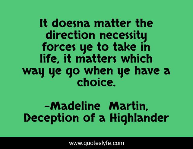 This page presents the quote "It doesna matter the direction necessity forces ye to take in life, it matters which way ye go when ye have a choice.". Author of this quote is Madeline Martin, Deception of a Highlander. This quote is about highlander-romance, historical-romance, scottish-romance,.
