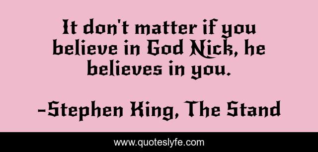 This page presents the quote "It don't matter if you believe in God Nick, he believes in you.". Author of this quote is Stephen King, The Stand. .