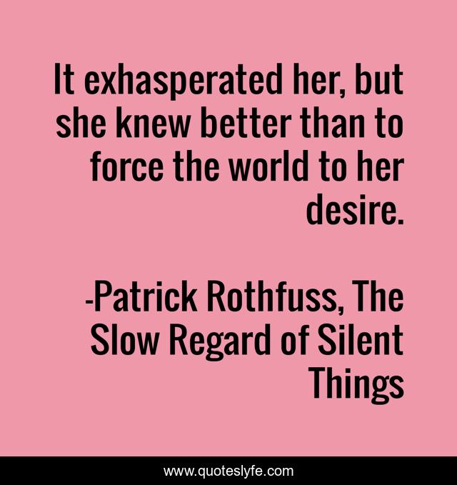 This page presents the quote "It exhasperated her, but she knew better than to force the world to her desire.". Author of this quote is Patrick Rothfuss, The Slow Regard of Silent Things. This quote is about patience, auri, world,.