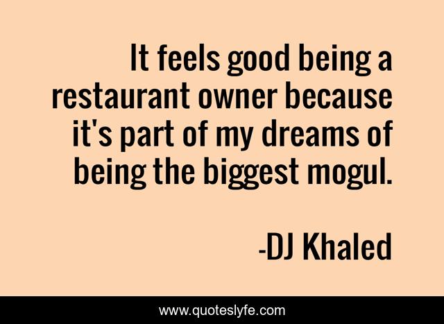 This page presents the quote "It feels good being a restaurant owner because it's part of my dreams of being the biggest mogul.". Author of this quote is DJ Khaled. This quote is about being, good, restaurant,.
