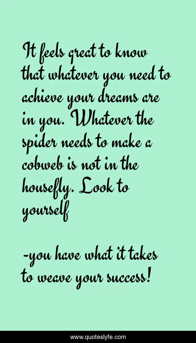 This page presents the quote "It feels great to know that whatever you need to achieve your dreams are in you. Whatever the spider needs to make a cobweb is not in the housefly. Look to yourself". Author of this quote is you have what it takes to weave your success!. This quote is about daily drive 365, israelmore ayivor,.