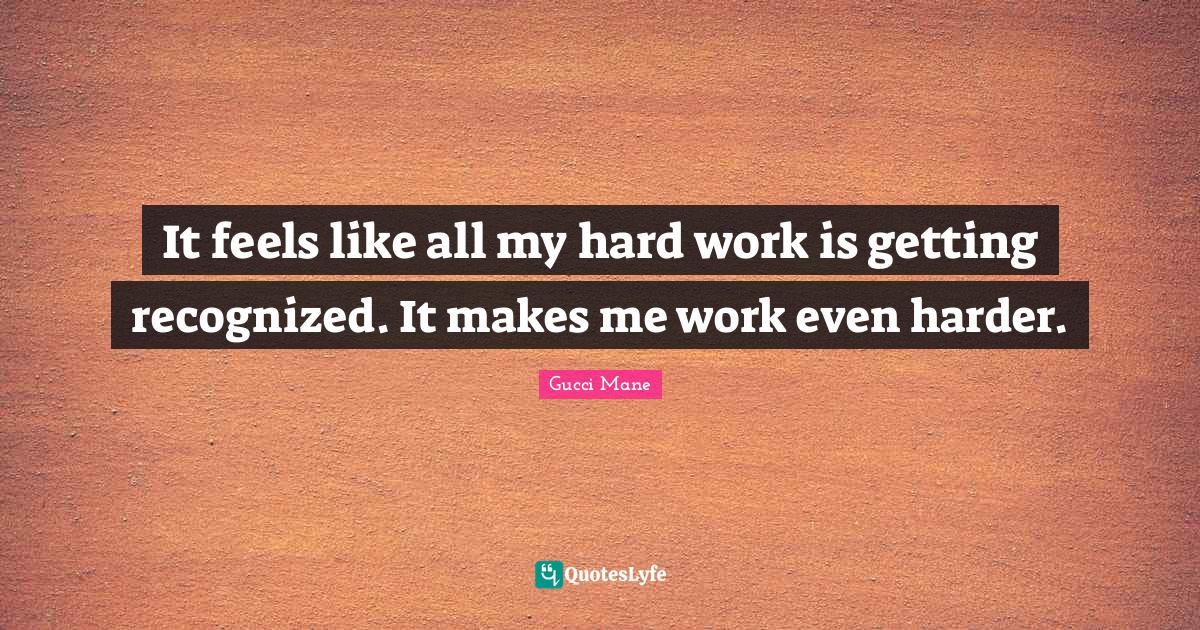 This page presents the quote "It feels like all my hard work is getting recognized. It makes me work even harder.". Author of this quote is Gucci Mane. This quote is about harder, feels, hard work, hard, work,.