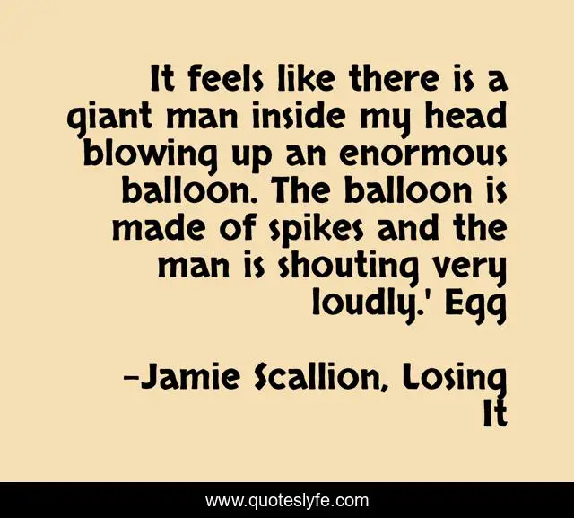 This page presents the quote "It feels like there is a giant man inside my head blowing up an enormous balloon. The balloon is made of spikes and the man is shouting very loudly.' Egg". Author of this quote is Jamie Scallion, Losing It. This quote is about young-adult-fiction, young-adult, young-adult-series,.