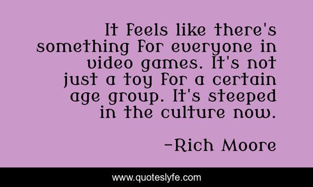 This page presents the quote "It feels like there's something for everyone in video games. It's not just a toy for a certain age group. It's steeped in the culture now.". Author of this quote is Rich Moore. This quote is about culture, video games, group,.