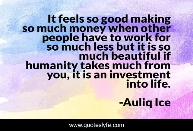 This page presents the quote "It feels so good making so much money when other people have to work for so much less but it is so much beautiful if humanity takes much from you, it is an investment into life.". Author of this quote is Auliq Ice. This quote is about charity-work, charity,.
