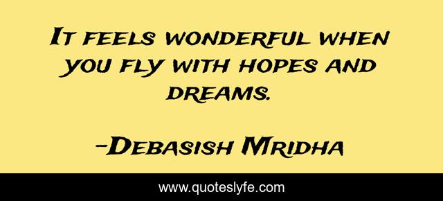This page presents the quote "It feels wonderful when you fly with hopes and dreams.". Author of this quote is Debasish Mridha. This quote is about philosophy, debasish-mridha, quotes, hopes-and-dreams, fly-with-hopes, hope, inspirational, enthusiasm, debasish-mridha-m-d,.