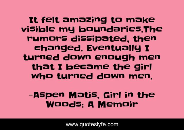 This page presents the quote "It felt amazing to make visible my boundaries.The rumors dissipated, then changed. Eventually I turned down enough men that I became the girl who turned down men.". Author of this quote is Aspen Matis, Girl in the Woods: A Memoir. This quote is about aspen-matis, memoir, hiking-the-pct,.