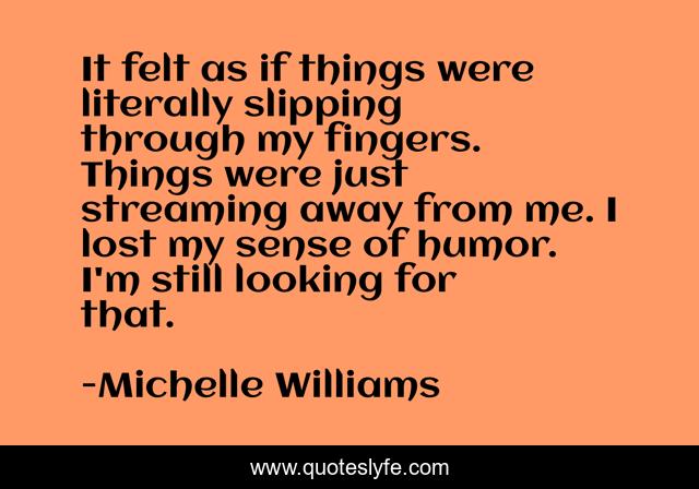 This page presents the quote "It felt as if things were literally slipping through my fingers. Things were just streaming away from me. I lost my sense of humor. I'm still looking for that.". Author of this quote is Michelle Williams. This quote is about me, looking, lost,.