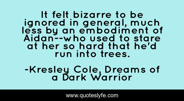 This page presents the quote "It felt bizarre to be ignored in general, much less by an embodiment of Aidan--who used to stare at her so hard that he'd run into trees.". Author of this quote is Kresley Cole, Dreams of a Dark Warrior. This quote is about aidan-the-fierce, valkyrie, kresley-cole, regin-the-radiant, dreams-of-a-dark-warrior, lore, berserker, immortals-after-dark, paranormal-romance,.