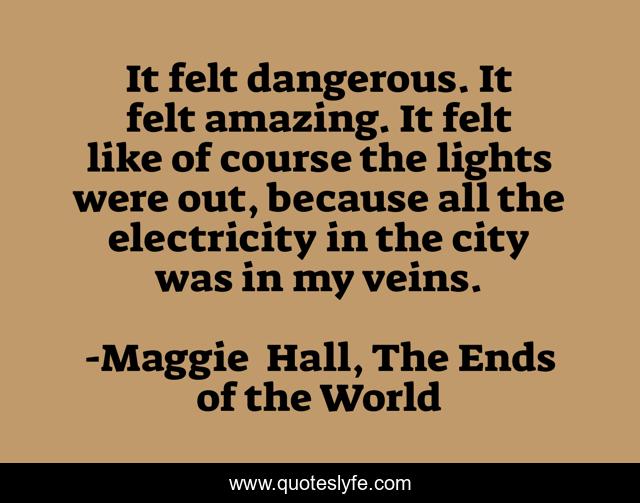 This page presents the quote "It felt dangerous. It felt amazing. It felt like of course the lights were out, because all the electricity in the city was in my veins.". Author of this quote is Maggie Hall, The Ends of the World. This quote is about love, the-conspiracy-of-us, affection,.