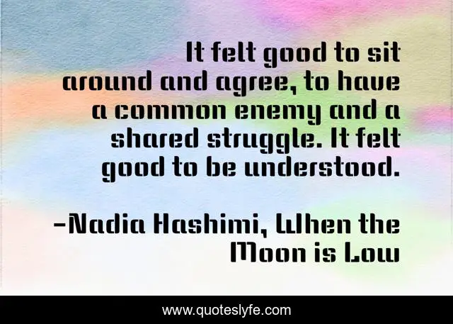 This page presents the quote "It felt good to sit around and agree, to have a common enemy and a shared struggle. It felt good to be understood.". Author of this quote is Nadia Hashimi, When the Moon is Low. This quote is about understand, agreement,.