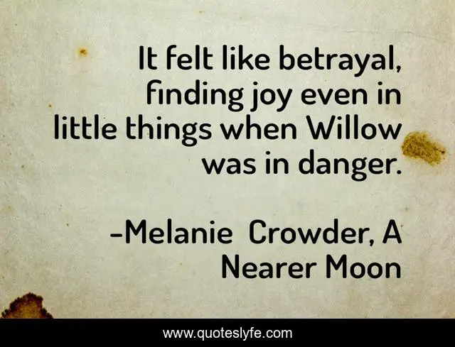 This page presents the quote "It felt like betrayal, finding joy even in little things when Willow was in danger.". Author of this quote is Melanie Crowder, A Nearer Moon. This quote is about fantasy, danger, sickness-and-diseases, kidlit, sadness, sisters, sisterhood,.