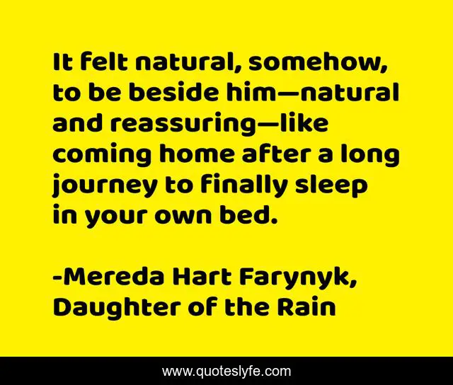 This page presents the quote "It felt natural, somehow, to be beside him—natural and reassuring—like coming home after a long journey to finally sleep in your own bed.". Author of this quote is Mereda Hart Farynyk, Daughter of the Rain. This quote is about home, love, friendship, affection,.