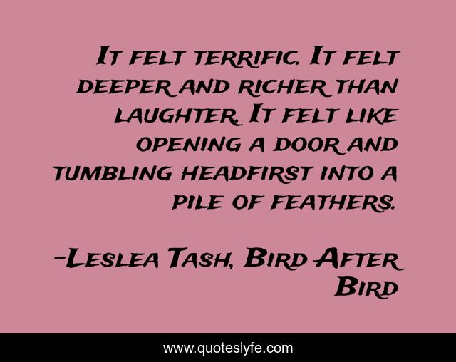 This page presents the quote "It felt terrific. It felt deeper and richer than laughter. It felt like opening a door and tumbling headfirst into a pile of feathers.". Author of this quote is Leslea Tash, Bird After Bird. This quote is about new-adult, romance, laughter, contemporary-romance,.