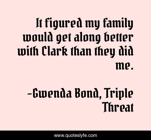 This page presents the quote "It figured my family would get along better with Clark than they did me.". Author of this quote is Gwenda Bond, Triple Threat. This quote is about broad-shoulders, clark-kent, family, awkwardness, compassion, falling-in-love, blue-eyes, lois-lane, friendship,.