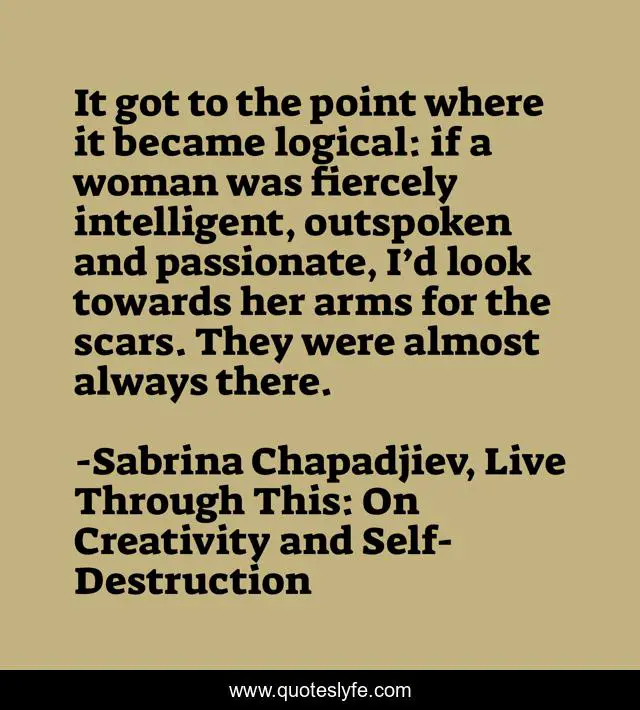 This page presents the quote "It got to the point where it became logical: if a woman was fiercely intelligent, outspoken and passionate, I’d look towards her arms for the scars. They were almost always there.". Author of this quote is Sabrina Chapadjiev, Live Through This: On Creativity and Self-Destruction. This quote is about mental-health, mental-illness, women,.