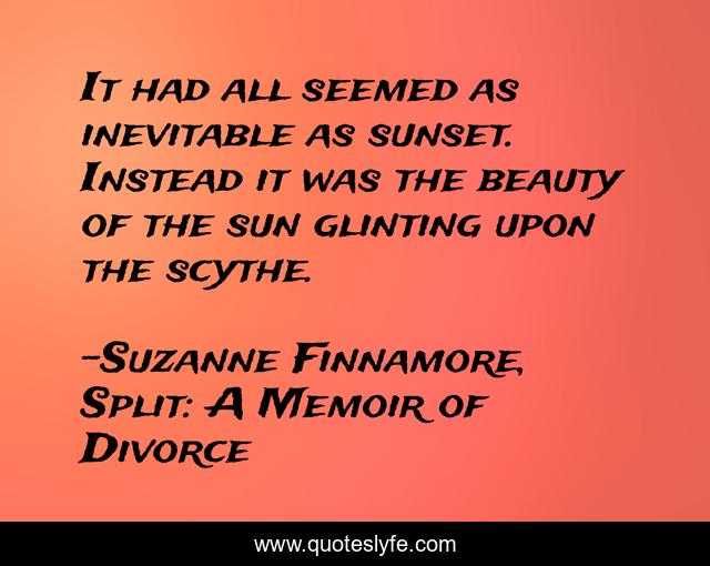 This page presents the quote "It had all seemed as inevitable as sunset. Instead it was the beauty of the sun glinting upon the scythe.". Author of this quote is Suzanne Finnamore, Split: A Memoir of Divorce. This quote is about relationships, infidelity, cheating, divorce, seperation, marriage,.