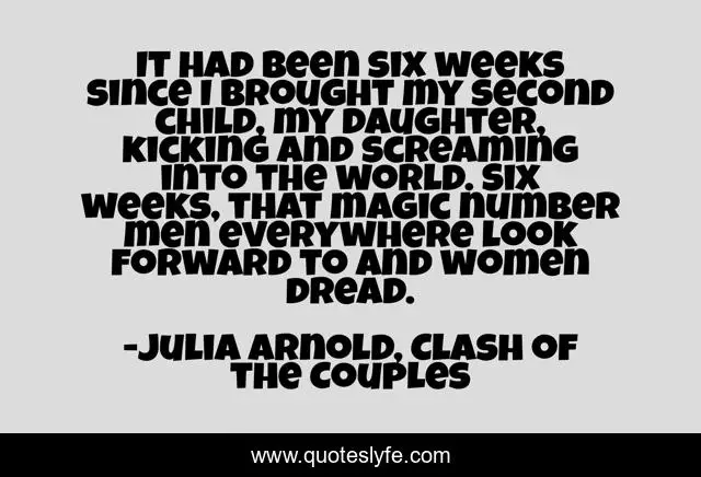 This page presents the quote "It had been six weeks since I brought my second child, my daughter, kicking and screaming into the world. Six weeks, that magic number men everywhere look forward to and women dread.". Author of this quote is Julia Arnold, Clash of the Couples. This quote is about motherhood, humor, babies,.