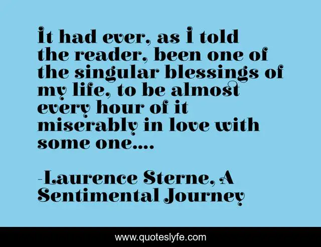 This page presents the quote "It had ever, as I told the reader, been one of the singular blessings of my life, to be almost every hour of it miserably in love with some one....". Author of this quote is Laurence Sterne, A Sentimental Journey. This quote is about desire, love, affection,.