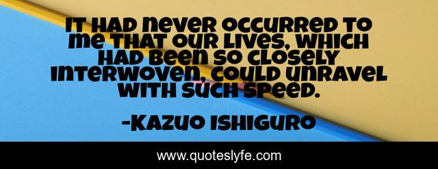 This page presents the quote "It had never occurred to me that our lives, which had been so closely interwoven, could unravel with such speed.". Author of this quote is Kazuo Ishiguro. This quote is about beautiful, enthusiasm, story, inspirational,.