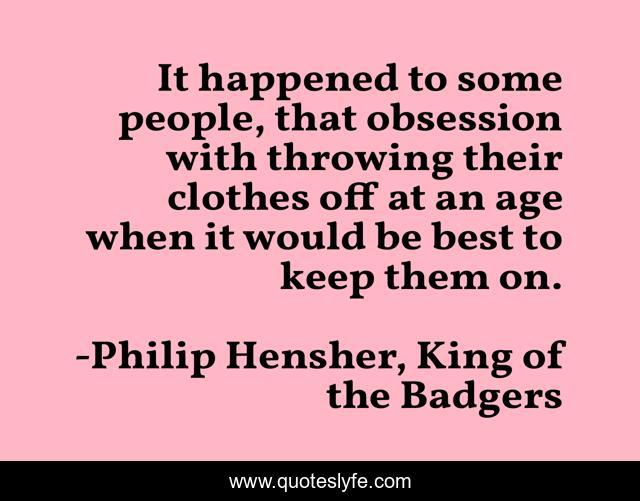 This page presents the quote "It happened to some people, that obsession with throwing their clothes off at an age when it would be best to keep them on.". Author of this quote is Philip Hensher, King of the Badgers. This quote is about throwing-off, age, clothes, obsession, people,.