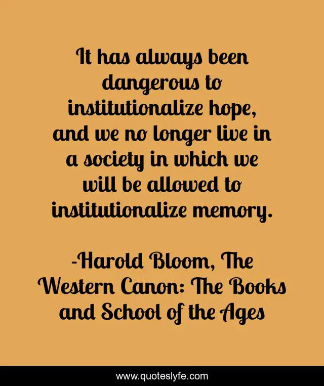 This page presents the quote "It has always been dangerous to institutionalize hope, and we no longer live in a society in which we will be allowed to institutionalize memory.". Author of this quote is Harold Bloom, The Western Canon: The Books and School of the Ages. This quote is about conventional-wisdom, resilience, assumptions, intimacy-with-god, idolatry, worship, materialism,.