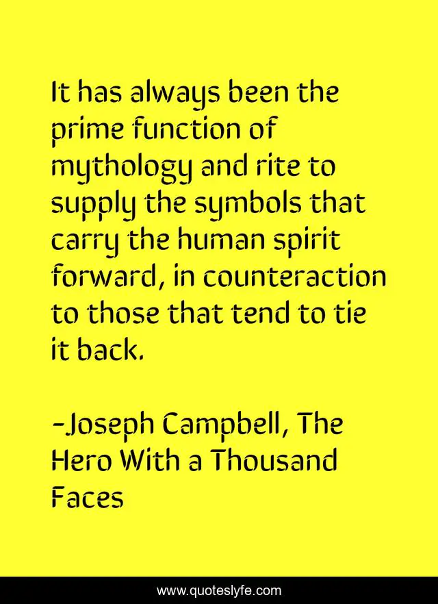 This page presents the quote "It has always been the prime function of mythology and rite to supply the symbols that carry the human spirit forward, in counteraction to those that tend to tie it back.". Author of this quote is Joseph Campbell, The Hero With a Thousand Faces. This quote is about symbolism, heroism, mythology, meaning, purpose,.