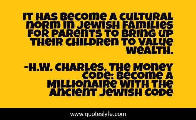 This page presents the quote "It has become a cultural norm in Jewish families for parents to bring up their children to value wealth.". Author of this quote is H.W. Charles, The Money Code: Become a Millionaire With the Ancient Jewish Code. This quote is about money, cultural, jewish-wealth, wealth,.