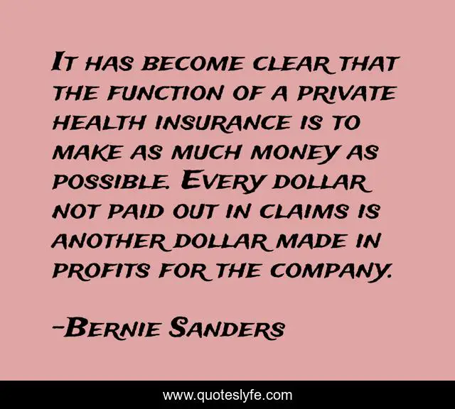 This page presents the quote "It has become clear that the function of a private health insurance is to make as much money as possible. Every dollar not paid out in claims is another dollar made in profits for the company.". Author of this quote is Bernie Sanders. This quote is about money, company, insurance,.