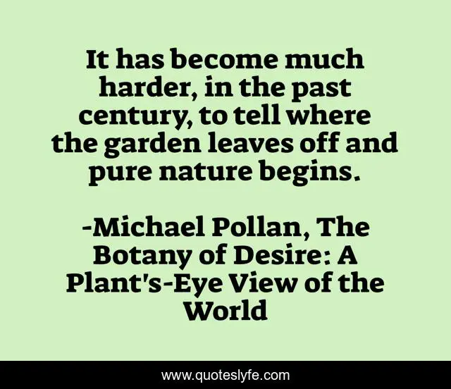 This page presents the quote "It has become much harder, in the past century, to tell where the garden leaves off and pure nature begins.". Author of this quote is Michael Pollan, The Botany of Desire: A Plant's-Eye View of the World. This quote is about page-xxii, garden, nature,.